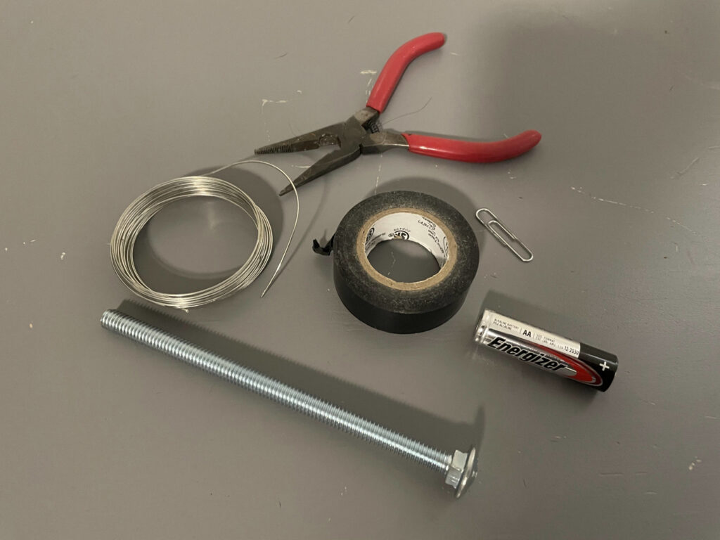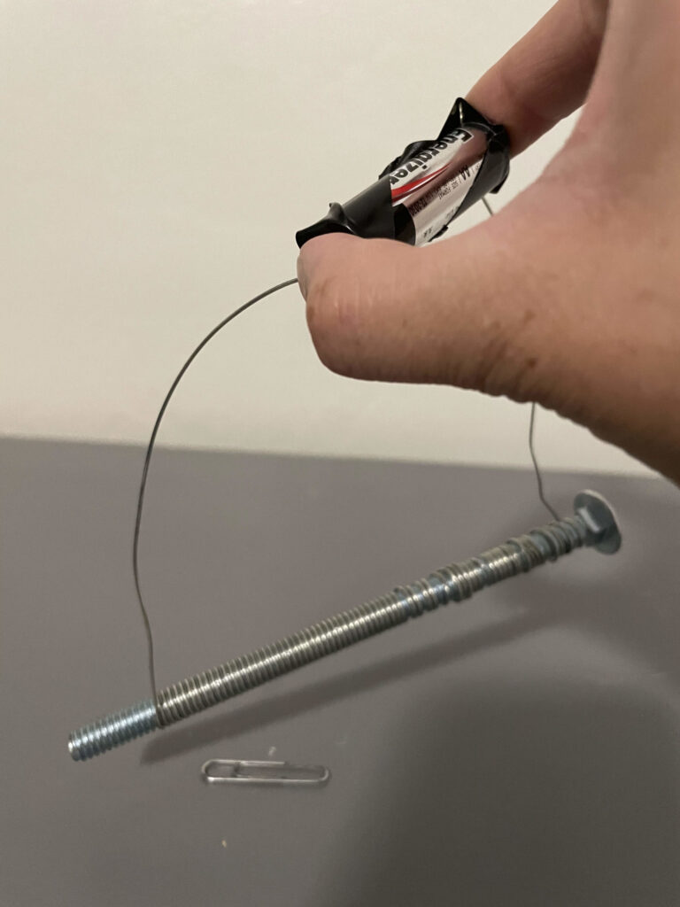 *Note: If your electromagnet doesn’t work right away, you may need to use some sandpaper to sand down the ends of the copper wire on both sides. Many copper wires are coated in other materials that need to be removed for this experiment to work.