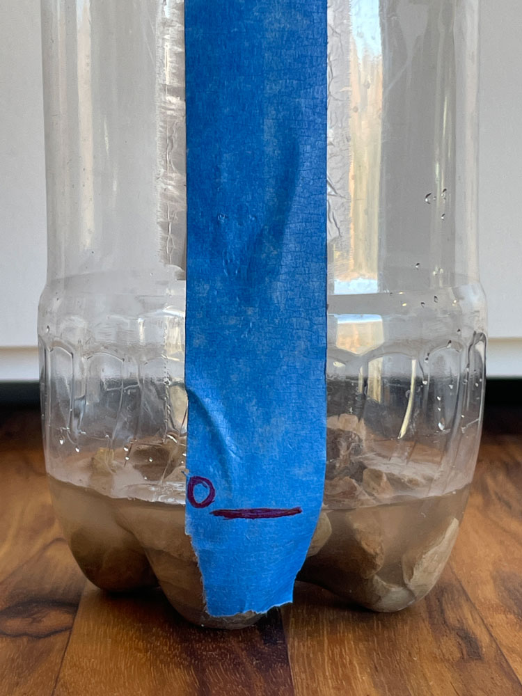 Put a strip of tape along the side of your bottle and use a ruler to place a mark that is 1 inch from the bottom of the bottle. Label this mark “0”.