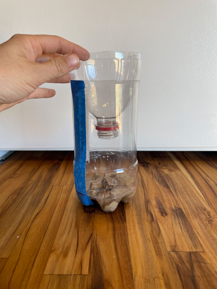 Take the top part of the bottle that you cut off and invert it into the bottom of the rain gauge to act as a funnel. You can use a few pieces of tape if needed to hold the funnel in place.